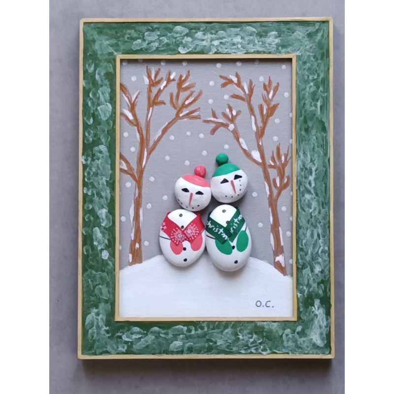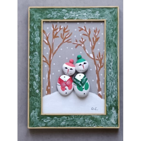 *Tableau réalisé sur toile, fond en peinture acrylique et garni de galets représentant des bonhommes de neige.