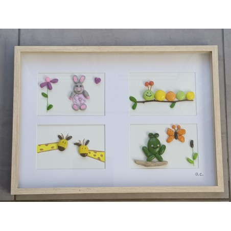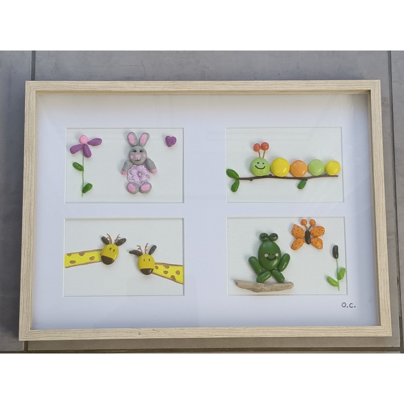 Tableau sous vitre avec animaux en galets peints