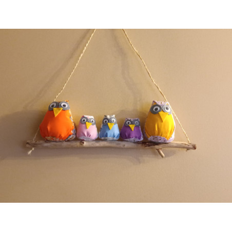 *les chouettes sont en tissu et sont fixées sur une branche de bois flotté.