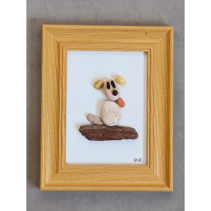 *Le chien est réalisé avec des galets vernis, il est posé sur du bois flotté.